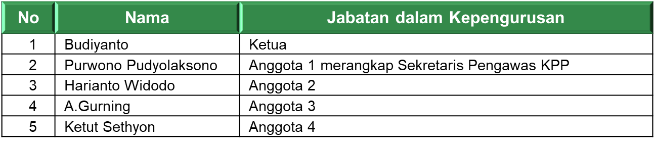 Berdasarkan Keputusan Pengawas Kerukunan Pensiunan Pegadaian Nomor 002/SK/DP-KPP/VI/2023 tanggal 13 Juni 2023 tentang Susunan Keanggotaan Pengawas Kerukunan Pensiunan Pegadaian, Pengawas Kerukunan Pensiunan Pegadaian menetapkan susunan Pengawas periode 2023 s.d. 2027 sebagai berikut: