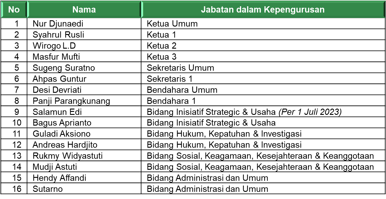 Berdasarkan Keputusan Pengurus Kerukunan Pensiunan Pegadaian Nomor 001/SK/PP-KPP/VI/2023 tanggal 13 Juni 2023 tentang Susunan Pengurus Pusat Kerukunan Pensiunan Pegadaian (PP-KPP), Pengurus Kerukunan Pensiunan Pegadaian menetapkan susunan Pengurus Pusat periode 2023 s.d. 2027 sebagai berikut: